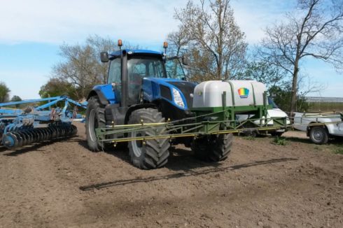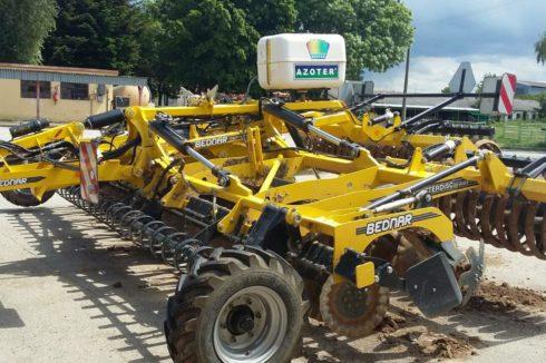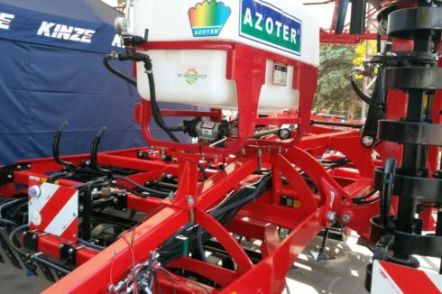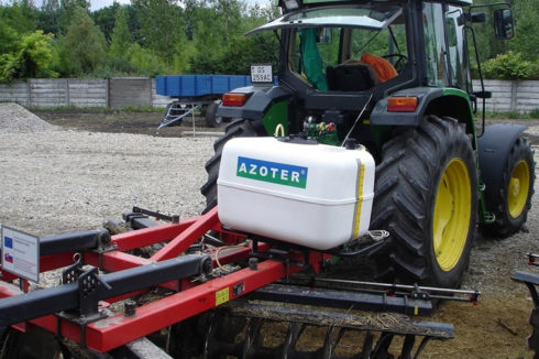 - Eine weitere Möglichkeit, AZOTER anzuwenden, ist die Ausbringung mithilfe von Applikatoren, die am Bodenbearbeitungsgerät montiert werden und für eine sofortige und direkte Einarbeitung des applizierten AZOTER-Düngers ins Bodenprofil sorgen. Zugleich werden Ausbringungskosten gespart und der eigentliche Arbeitsgang vereinfacht. Ausbringung mithilfe von fest am Arbeitsgerät (Kompaktor, Scheibenegge, Grubber) montierten Applikatoren mit einem Tankvolumen von 200 l und 400 l, mit regelbaren Arbeitsbreiten je nach Breite des eingesetzten Arbeitsgeräts. Dieser Applikator ist zudem mit einer eigenen Steuerung und einem eigenen Elektromotor ausgestattet, der an die Schlepperbatterie angeschlossen wird. Der Applikator-Tank wird mit AZOTER-Konzentrat befüllt, eine Verdünnung mit Wasser im Verhältnis von 1:1 ist ebenfalls möglich.