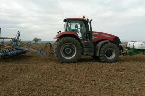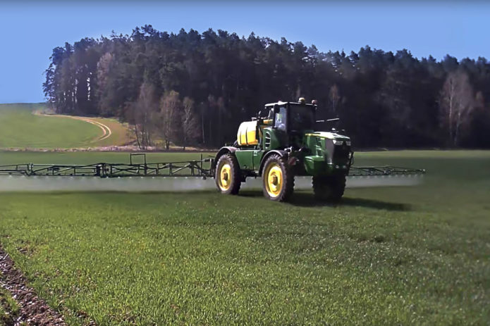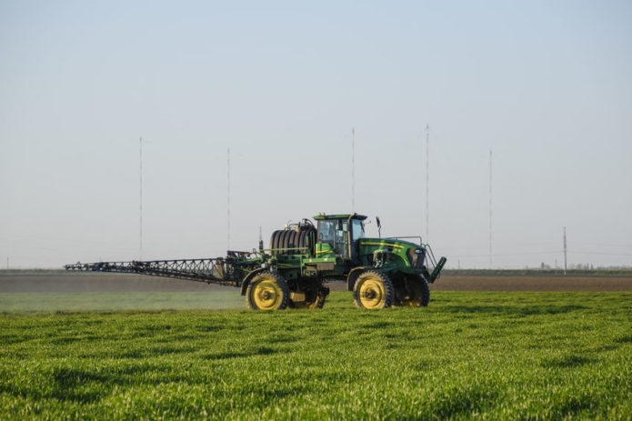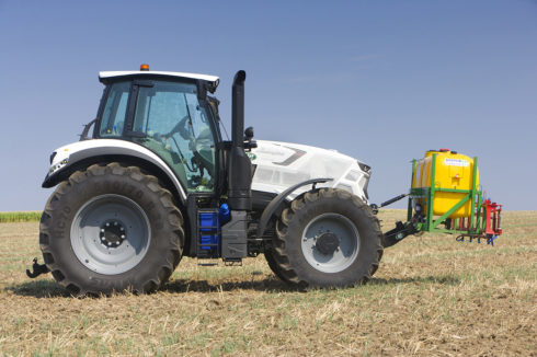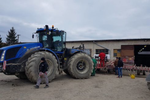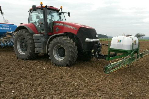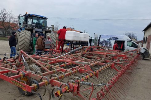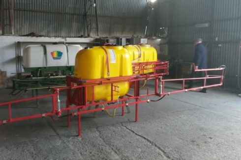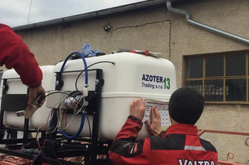 - Möglich ist auch eine Ausbringung mithilfe von Applikatoren mit einem Tankvolumen von 400 l und 600 l, mit regelbaren Arbeitsbreiten bis 10 m, im Frontanbau an der Dreipunkt-Aufnahme des Schleppers (vorderer Kardan-Abgang wird nicht benötigt, da der Applikator mit einer eigenen Steuerung und mit einem eigenen Elektromotor, der an die Schlepper-Batterie angeschlossen wird, ausgestattet ist). Der Applikator-Tank wird mit AZOTER-Konzentrat befüllt, eine Verdünnung mit Wasser im Verhältnis von 1:1 ist ebenfalls möglich.