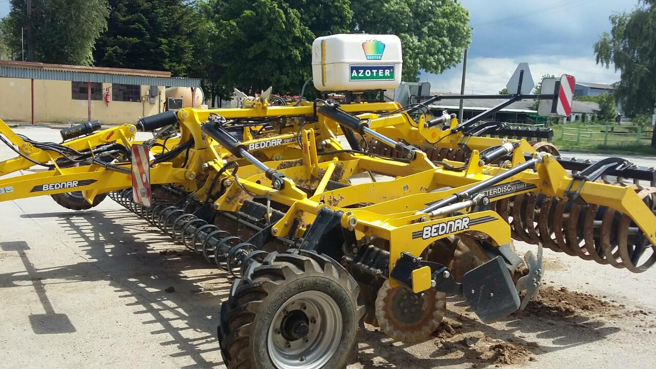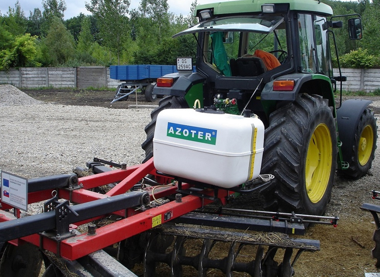 - Eine weitere Möglichkeit, AZOTER anzuwenden, ist die Ausbringung mithilfe von Applikatoren, die am Bodenbearbeitungsgerät montiert werden und für eine sofortige und direkte Einarbeitung des applizierten AZOTER-Düngers ins Bodenprofil sorgen. Zugleich werden Ausbringungskosten gespart und der eigentliche Arbeitsgang vereinfacht. Ausbringung mithilfe von fest am Arbeitsgerät (Kompaktor, Scheibenegge, Grubber) montierten Applikatoren mit einem Tankvolumen von 200 l und 400 l, mit regelbaren Arbeitsbreiten je nach Breite des eingesetzten Arbeitsgeräts. Dieser Applikator ist zudem mit einer eigenen Steuerung und einem eigenen Elektromotor ausgestattet, der an die Schlepperbatterie angeschlossen wird. Der Applikator-Tank wird mit AZOTER-Konzentrat befüllt, eine Verdünnung mit Wasser im Verhältnis von 1:1 ist ebenfalls möglich.